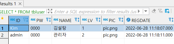 values('admin', '0000', '관리자', '2', DEFAULT, default);