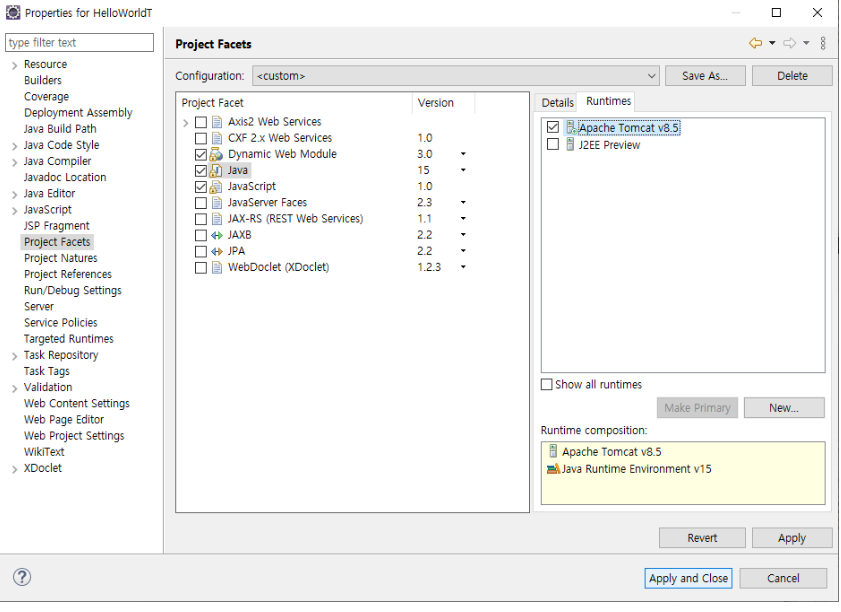 Project Facets > java >> runtime 탭 > Apache Tomcat 설정 Apply